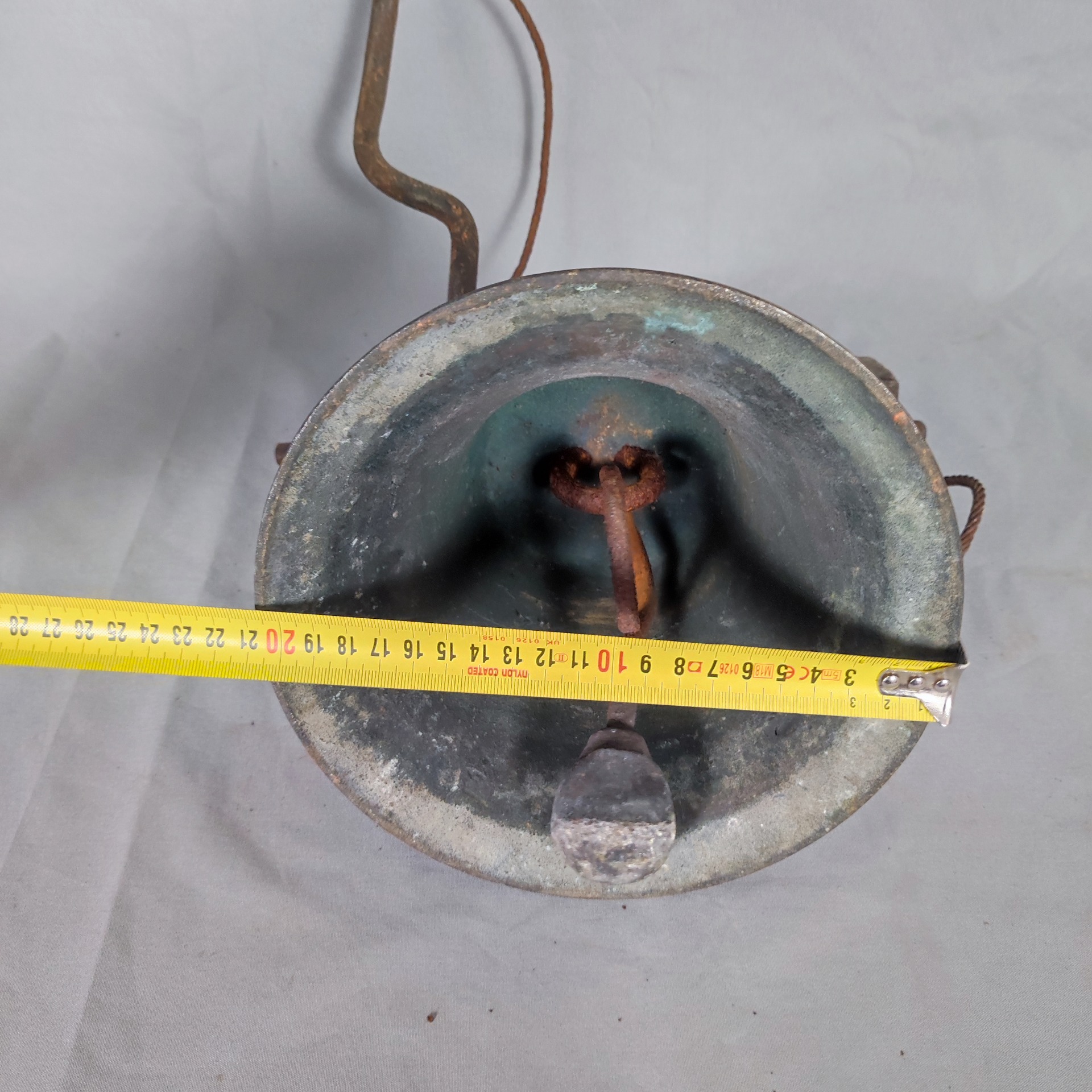 Zvon je v autentickém původním stavu s výraznou patinou. Kovové tělo bez prasklin, dřevěná hlavice dochovaná, lano původní nebo staré. Stopy používání odpovídají stáří. Vhodné jako dekorativní, sběratelský nebo funkční zvon.