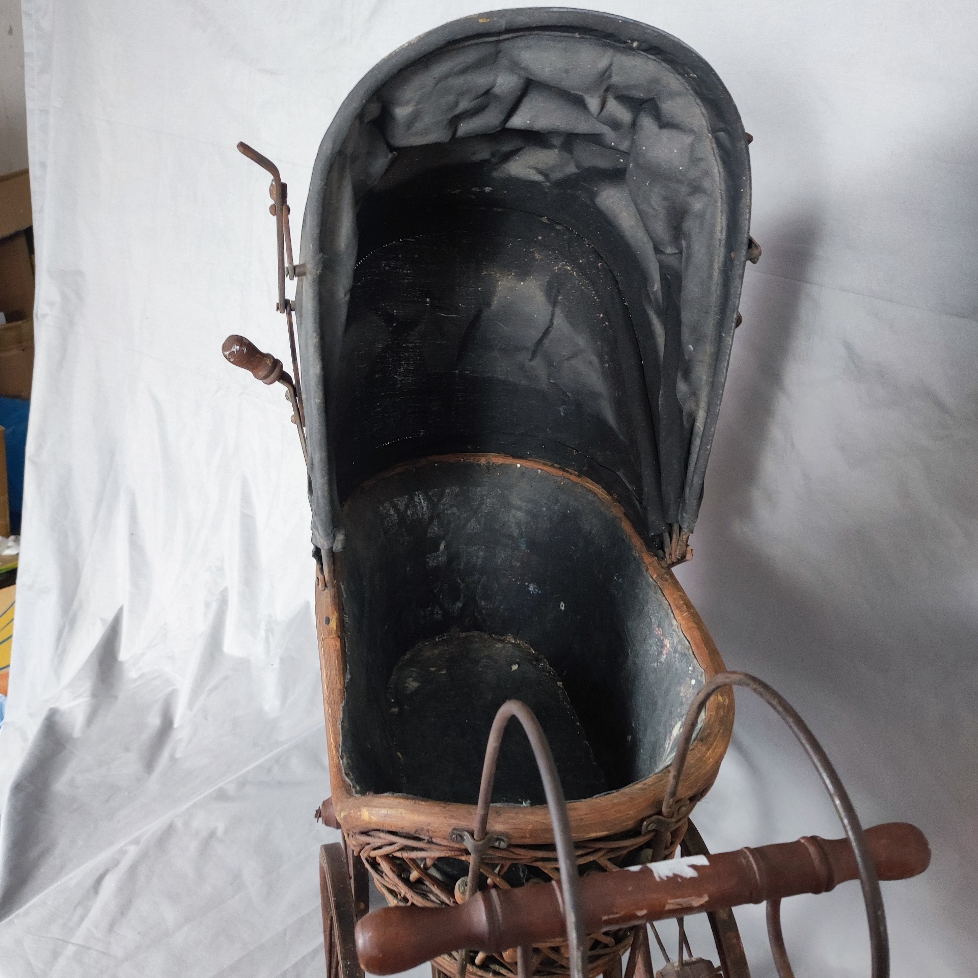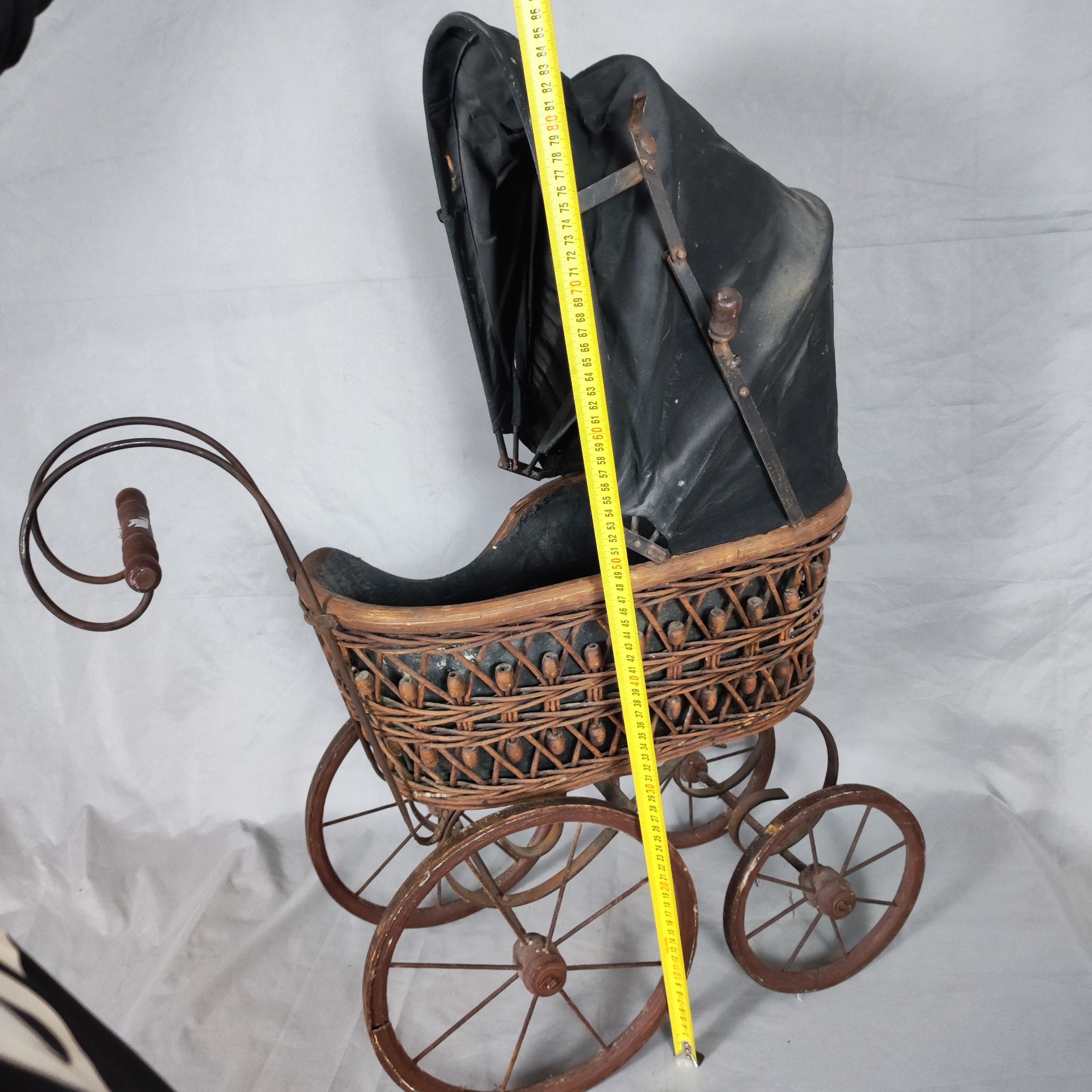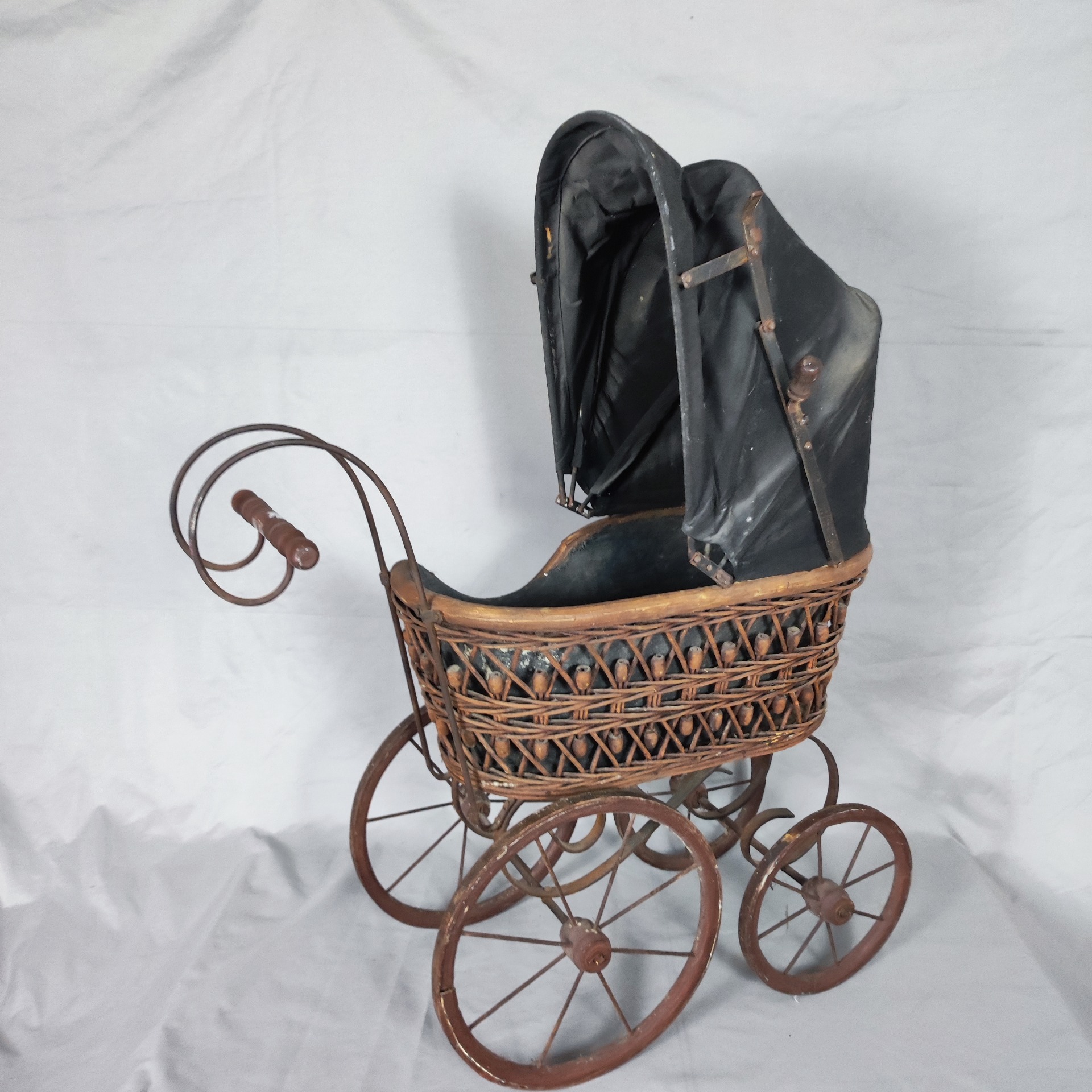 Kočárek je v původním stavu s přirozenou patinou. Proutí je zachovalé, kovový podvozek pevný, kolečka se otáčí. Textilní část odpovídá stáří. Nejde o funkční kočárek pro dítě, ale o dekorativní a sběratelský kus.