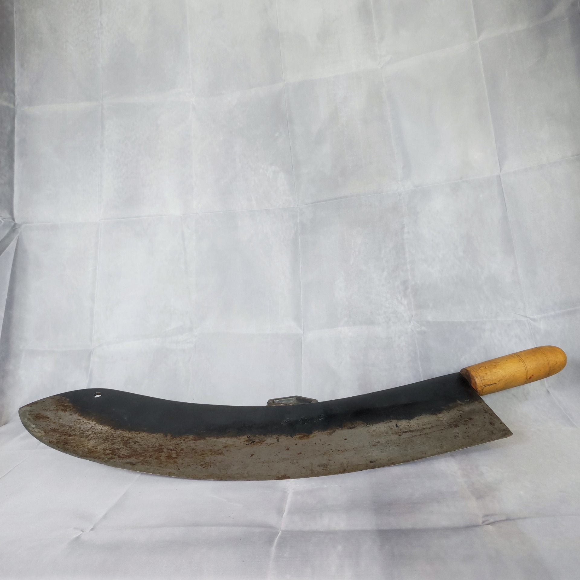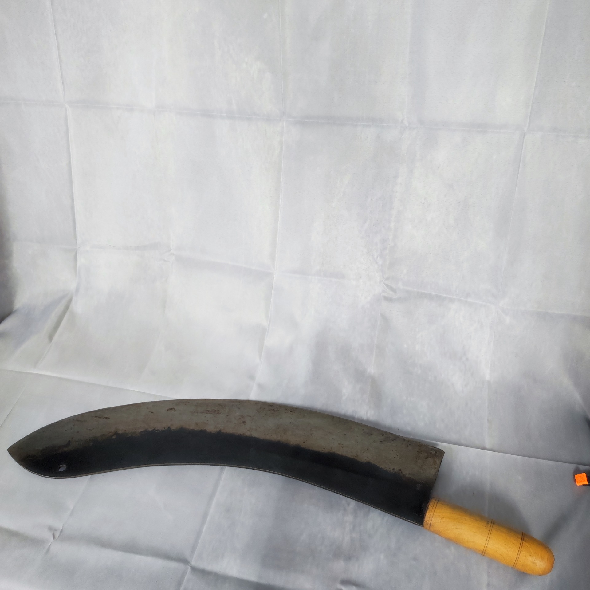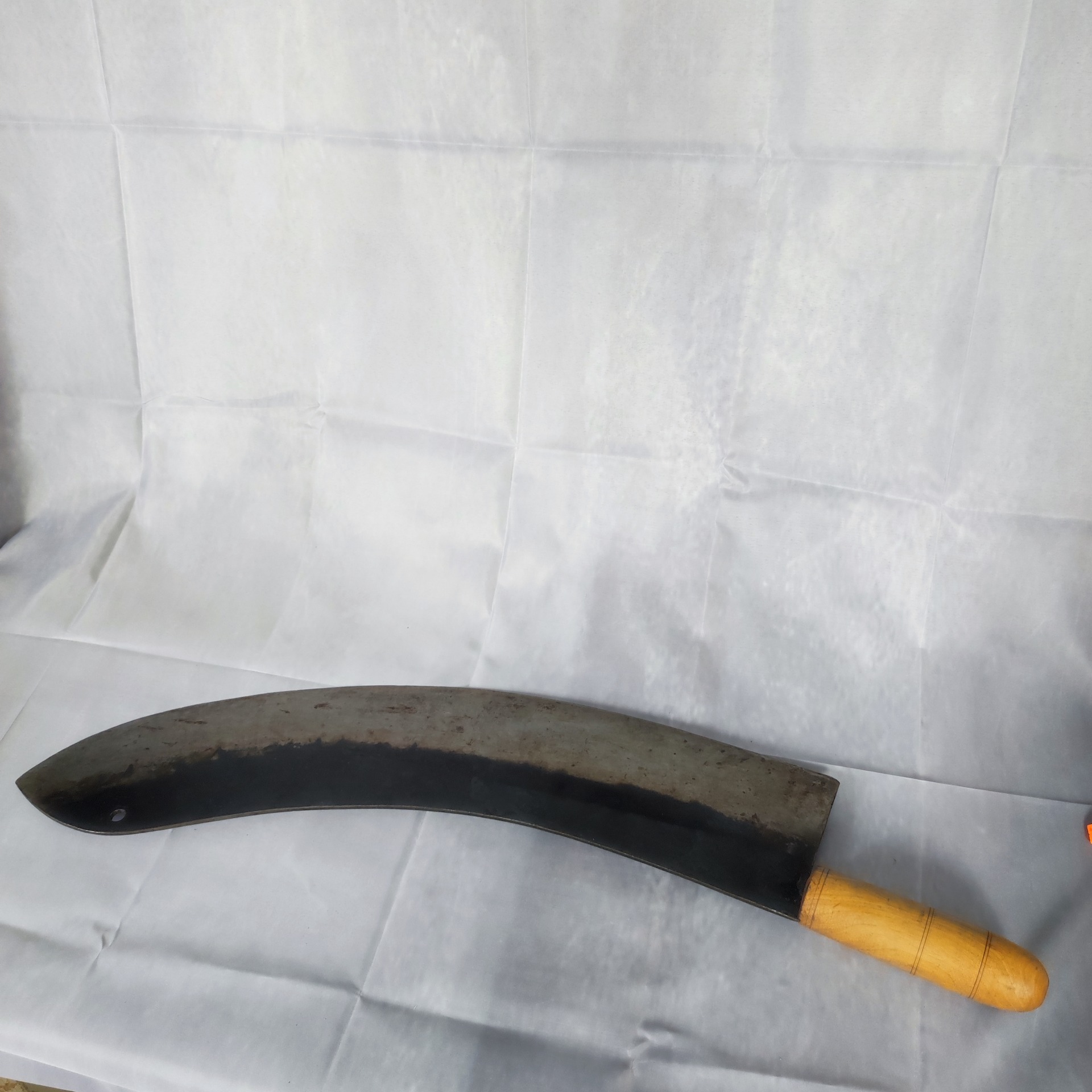 Nalezeno v dílně při vyklízení starého domu, schované mezi hřebíky a zbytky nářadí. Takové kusy už se nekovají – každý záhyb, každé zabarvení čepele je stopa po rukách, které ji kdysi brousily.