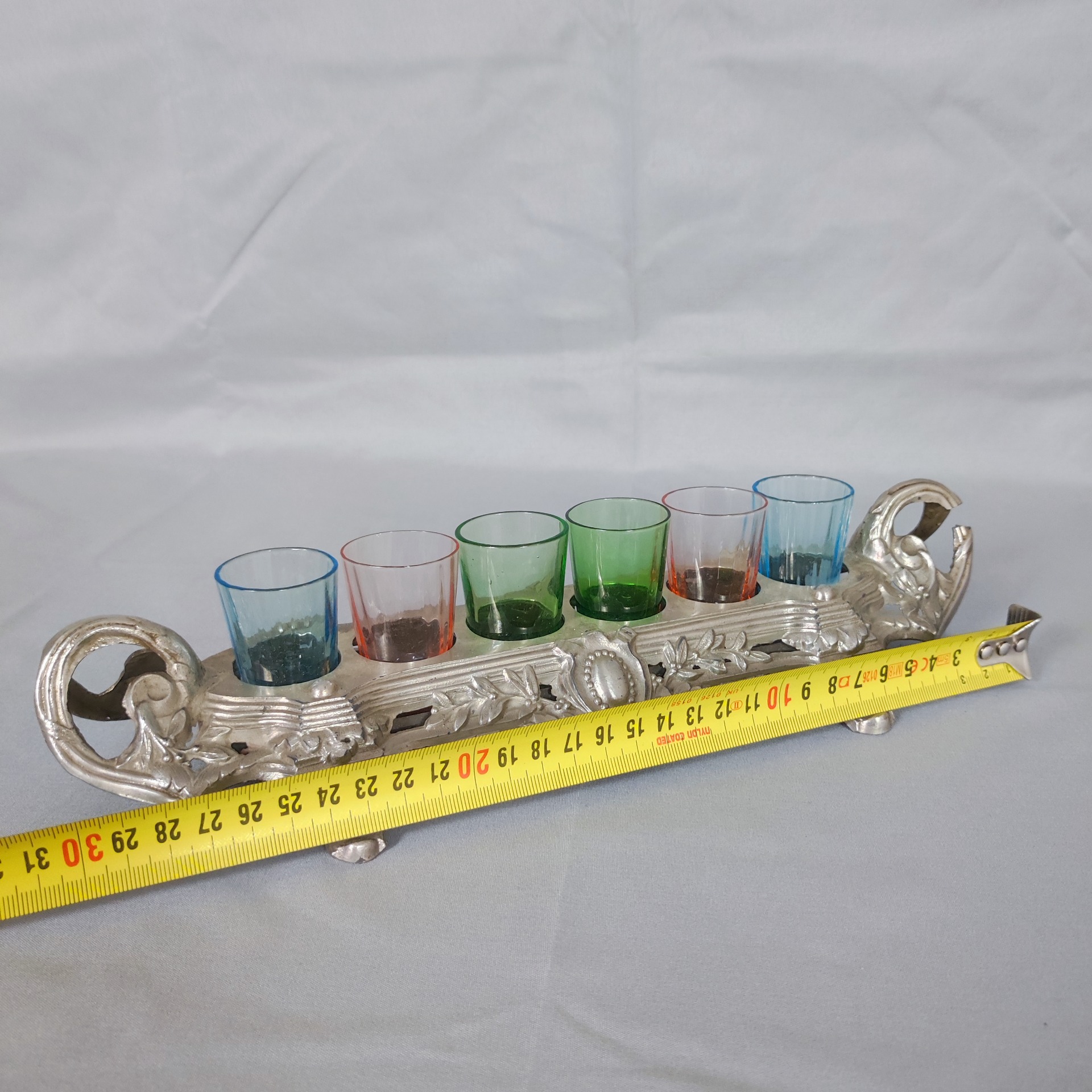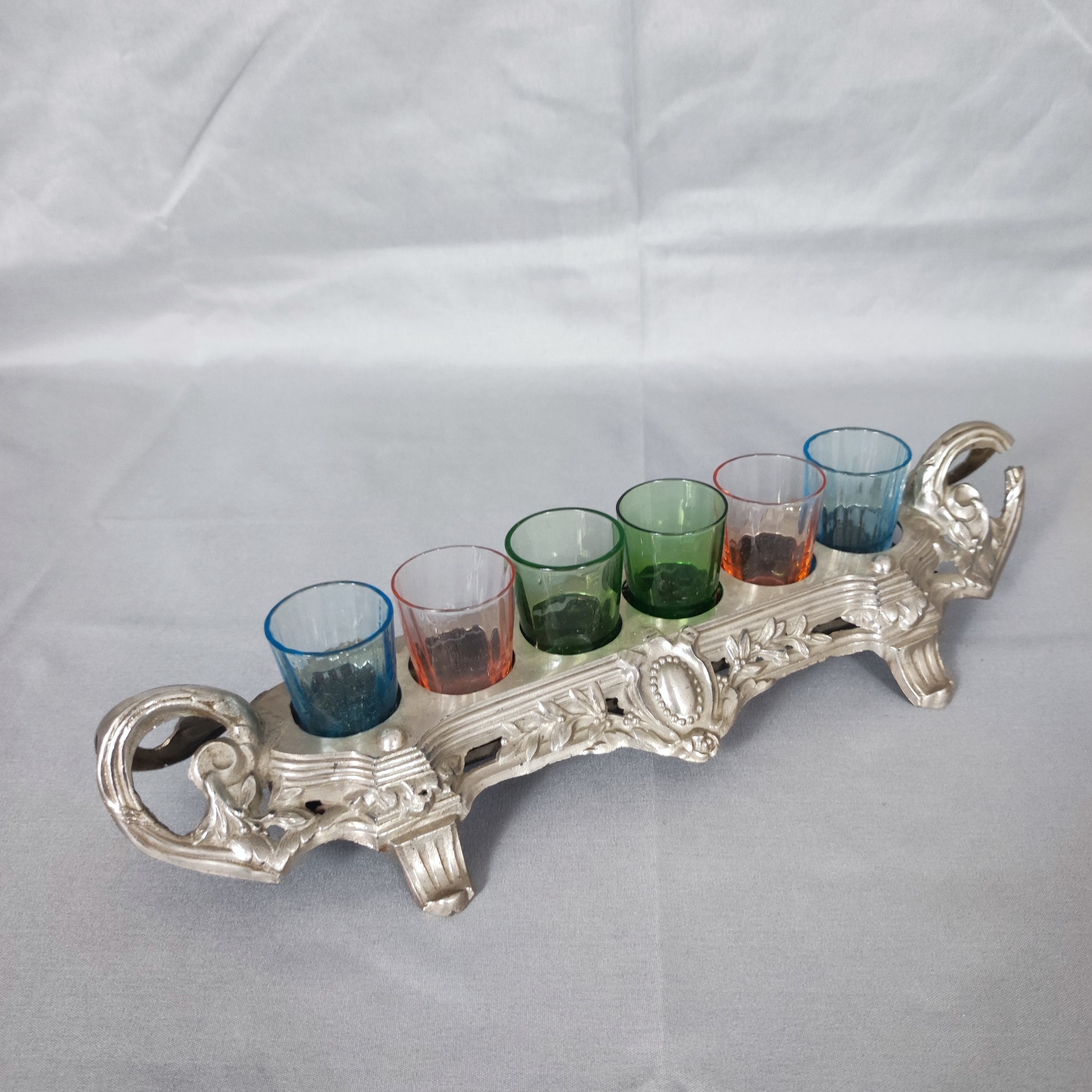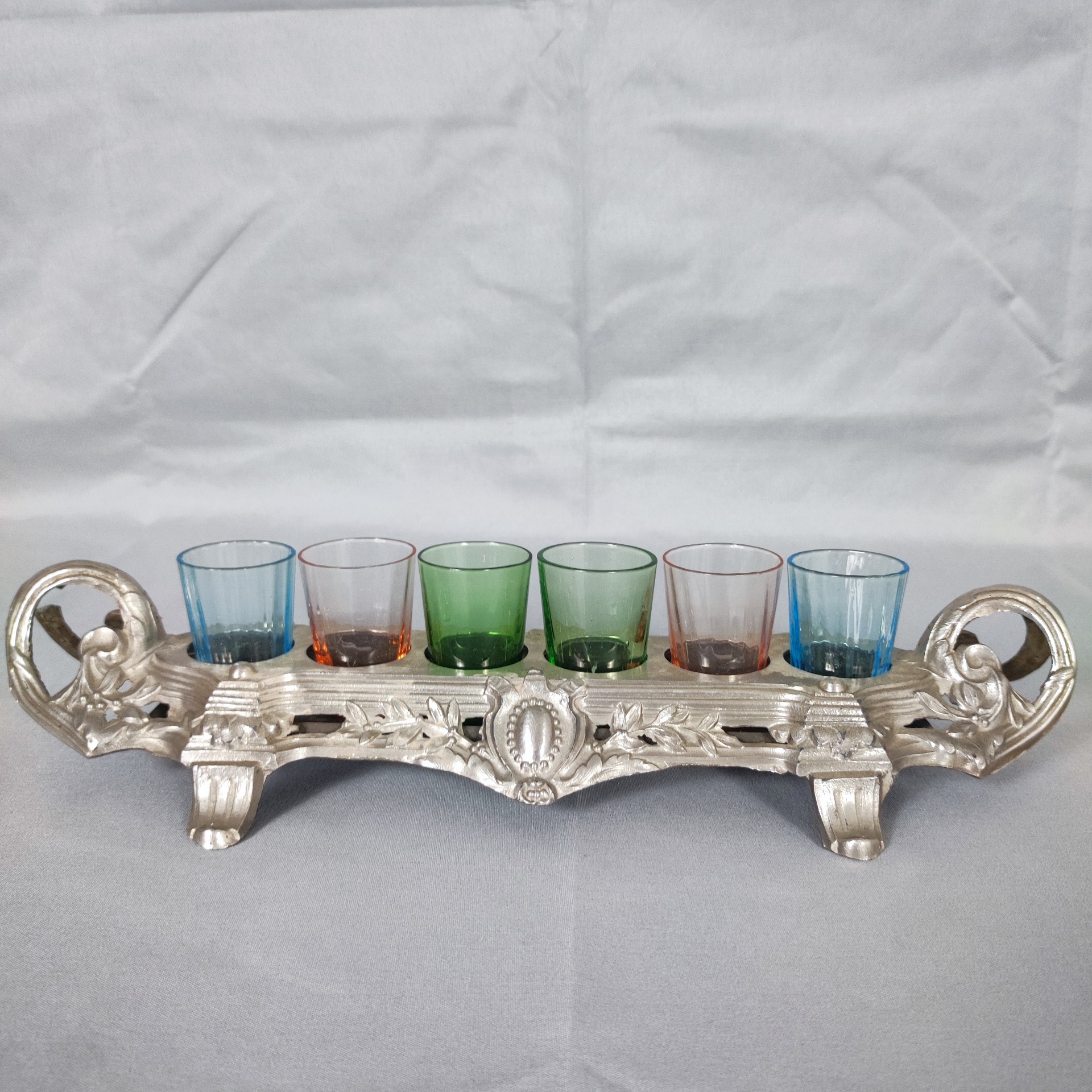 Starý kovový stojan na šest malých sklenek, lehce secesní tvar s plastickým dekorem. Původní barevné sklenky – zelené, modré a jantarové – krásně hrají na světle.