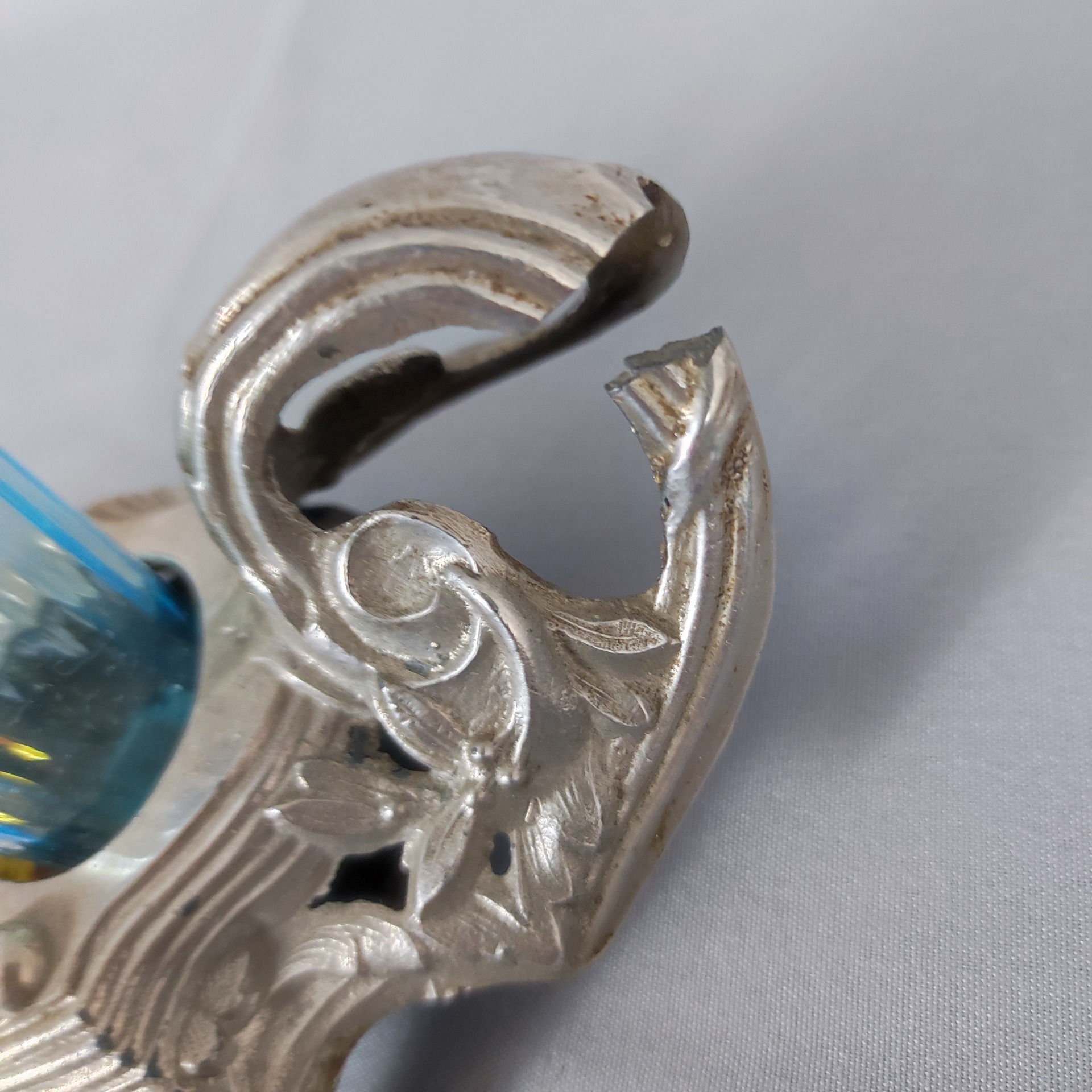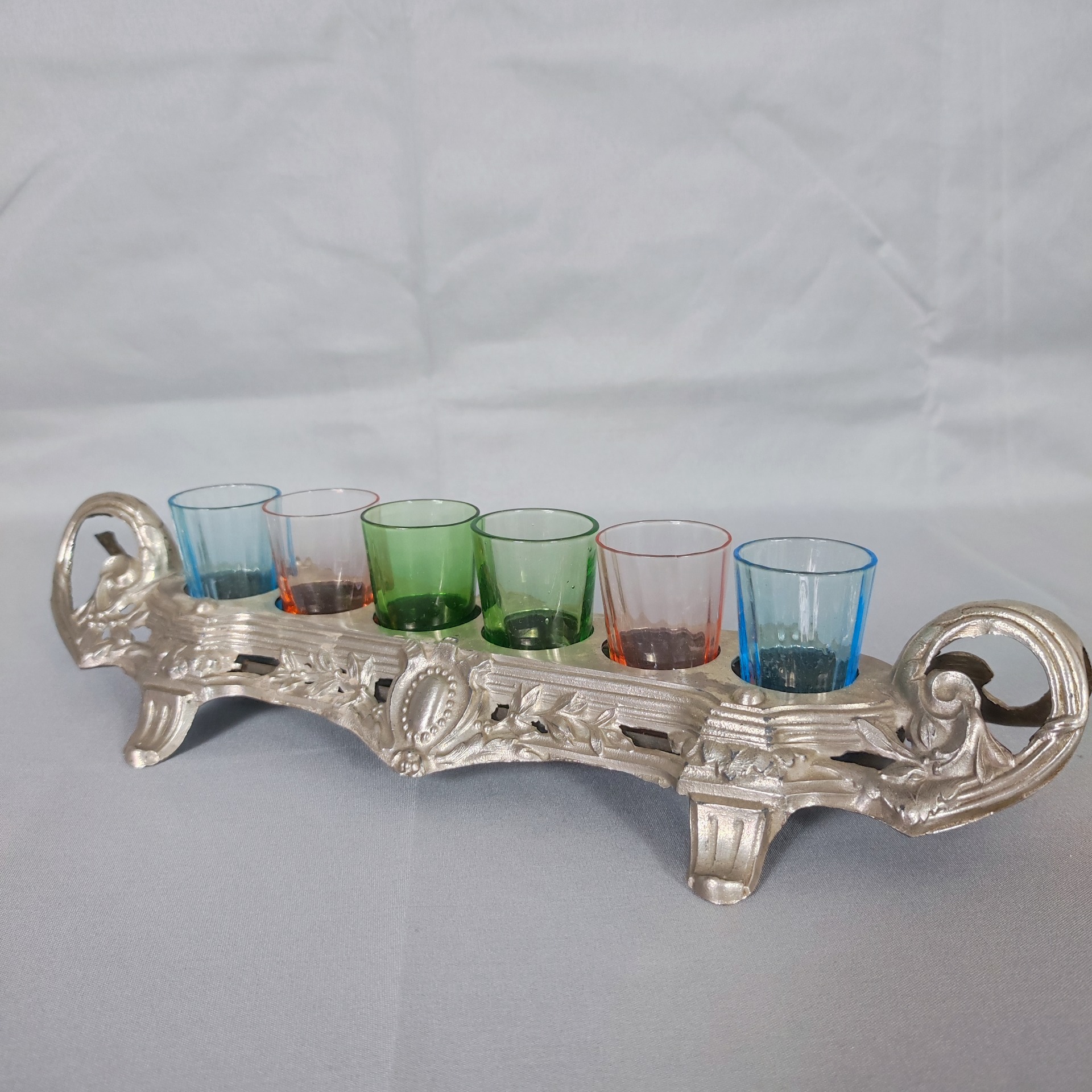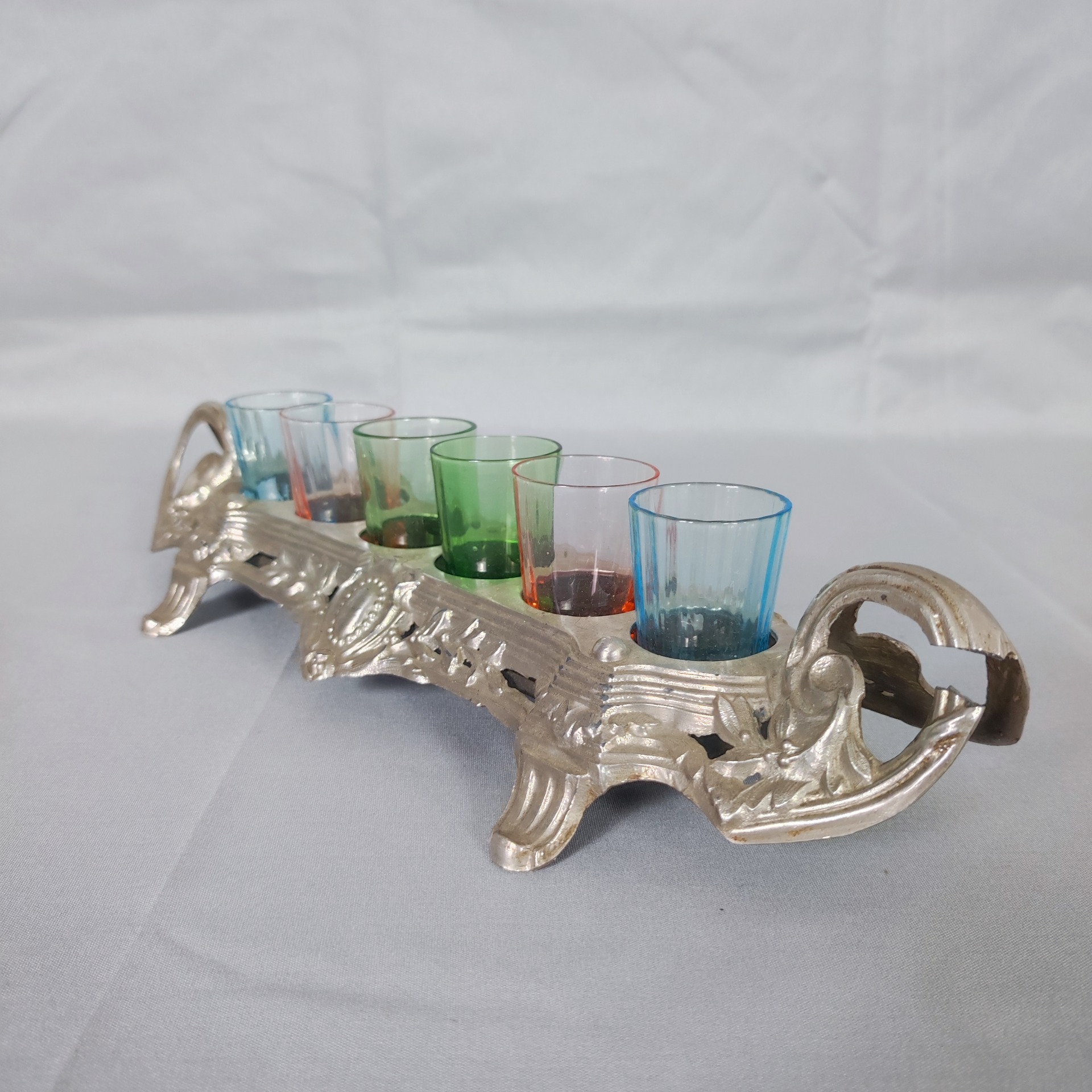Starý kovový stojan na šest malých sklenek, lehce secesní tvar s plastickým dekorem. Původní barevné sklenky – zelené, modré a jantarové – krásně hrají na světle.