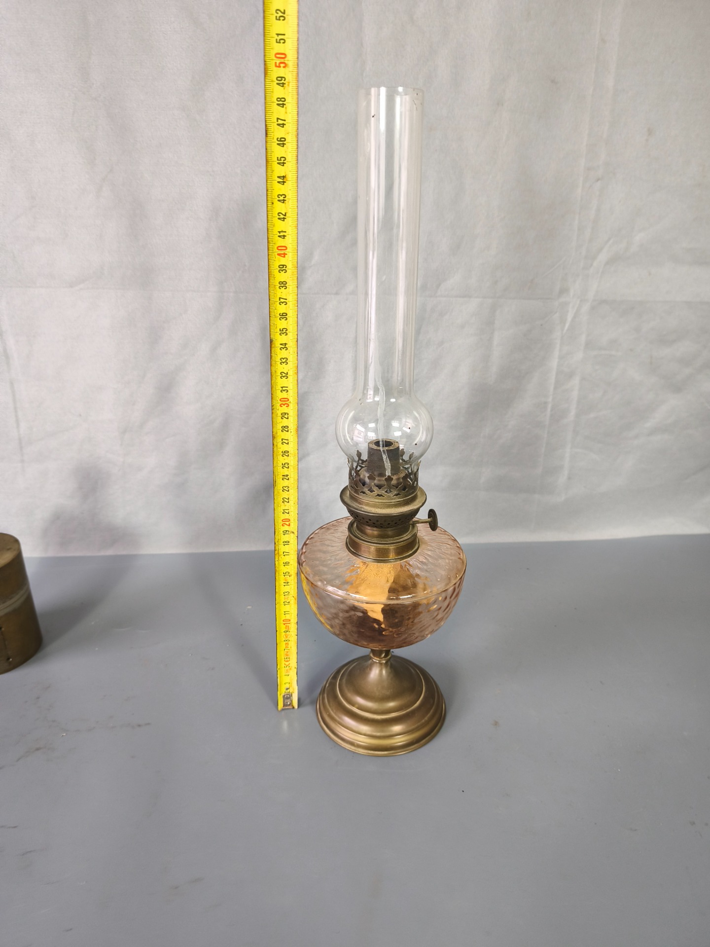 Někde mezi koncem 19. a začátkem 20. století stála tahle lampa na stole, kde večer nebyl hluk, jen ticho, kniha a plamen. Skleněná nádrž v jemném růžovém tónu chytá světlo tak, že ho netlačí, ale uklidňuje. Mosazná noha má za sebou roky služby – žádný lesk z obchodu, ale poctivou patinu času, kterou už dnes nikdo neumí vyrobit.