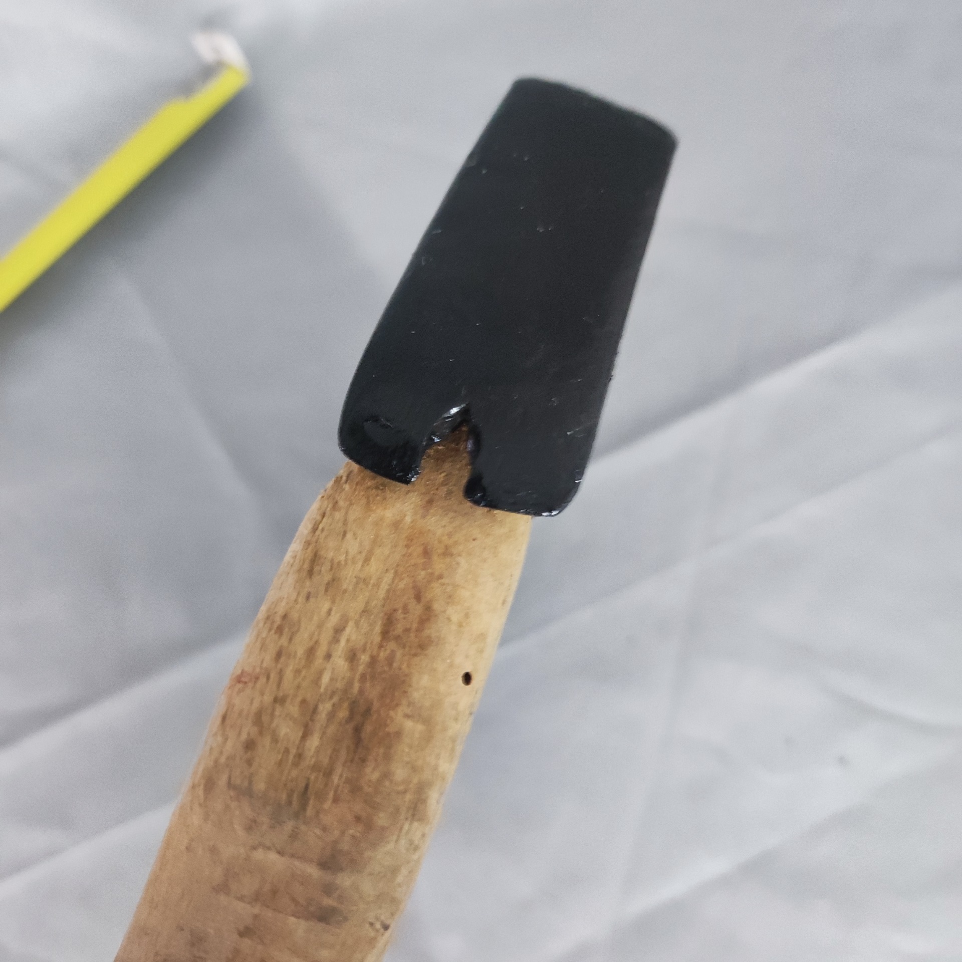 Hlava je kovaná, čerstvě očištěná a ošetřená černým nátěrem. Topůrko původní, pevné a hladké, s krásnou přirozenou kresbou dřeva. Poctivý kus československého železa, který pořád drží tvar i duši.