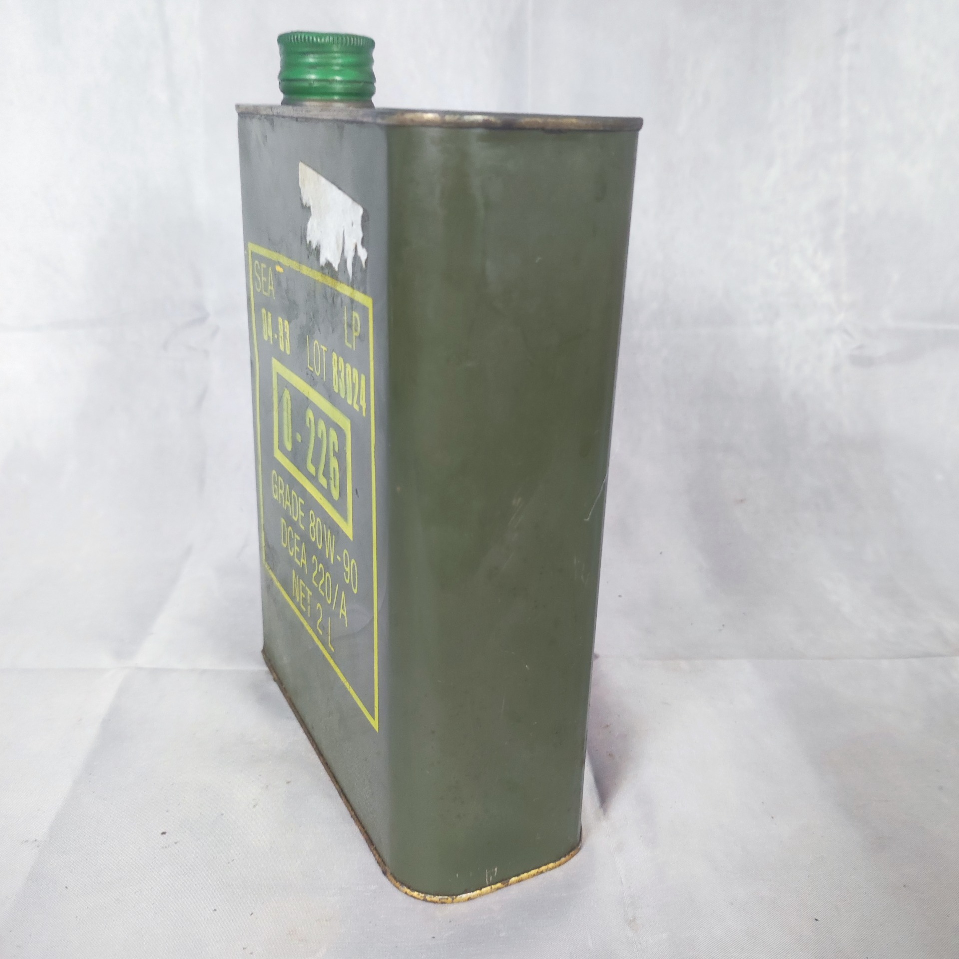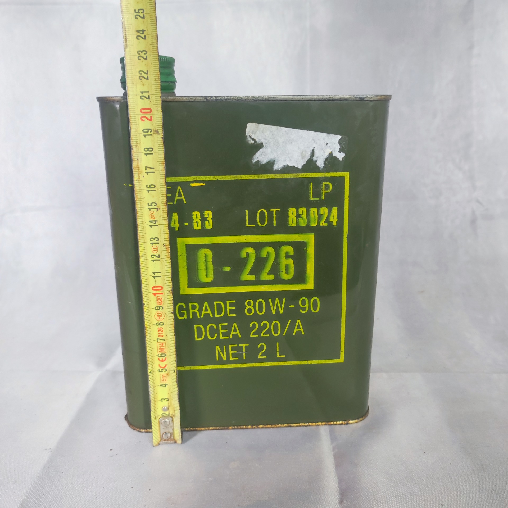 Zelený plech, žlutý tisk a vůně garáže, co se už dávno ztratila. Olejová nádoba s označením O-226, vyrobená v dubnu 1983, určená pro armádní servis převodů. Tyhle plechovky stávaly v řadách na regálech, každá měla svůj štítek a přesné číslo. Když se otevřely, byl v nich svět mechaniků, šroubů a oleje, který držel stroje při životě. Dnes už je to spíš připomínka doby, kdy i obyčejná nádoba měla váhu a důvod.